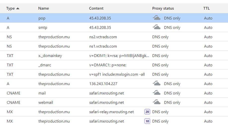 - Add MX records in CloudFlare DNS settings as provided by MXRoute. (Name: @ or domain name)